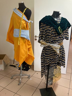 Ils se sont servis du stock de vêtements qui se trouvait dans L’autre Lieu pour créer une petite collection de mode dans les tons jaunes, oranges et bleus.